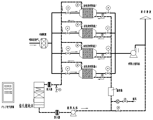 2. 系統(tǒng)由4個(gè)活性炭吸附箱(3用1備),1個(gè)催化燃燒床構(gòu)成,將各條生產(chǎn)線中的所有排氣管合并連接引至凈化設(shè)備,各個(gè)支管上安裝一只手動(dòng)調(diào)節(jié)閥,配比例調(diào)節(jié);廢氣經(jīng)收集匯總后送入集氣箱,再將廢氣送入干式過濾器,干式過濾器能更為精細(xì)的祛除廢氣中的粉塵和漆霧,從而避免活性炭微孔被堵塞,延長活性炭的使用周期,活性炭吸附器接近飽和時(shí),系統(tǒng)將自動(dòng)切換到備用活性炭吸附箱(此時(shí)飽和活性炭吸附箱停止吸附操作),然后用熱氣流對(duì)飽和活性炭吸附箱進(jìn)行解吸脫附,將有機(jī)物從活性炭上脫附下來。在脫附過程中,有機(jī)廢氣已被濃縮,濃度后的濃度較原濃度提高幾十倍,達(dá)2000mg/m3以上,濃縮廢氣送到催化燃燒裝置,最后被分解成CO2與H2O排出。完成解吸脫附后,活性炭吸附器進(jìn)入待用狀態(tài),待其他活性炭吸附箱接近飽和時(shí),系統(tǒng)再自動(dòng)切換回來,同時(shí)對(duì)飽和活性炭吸附器進(jìn)行解吸脫附,如此循環(huán)工作。最后凈化后的潔凈氣體由主排風(fēng)機(jī)排入大氣中。